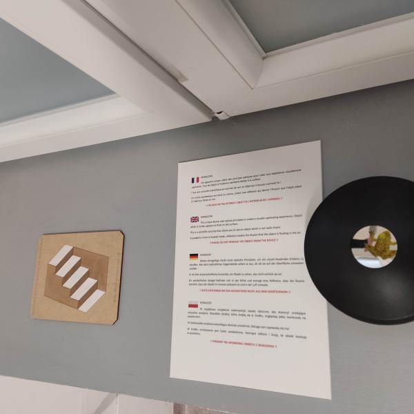 L’exposition propose des illusions d’optique célèbres, des images en mouvement et des installations conçues pour surprendre et amuser les visiteurs, comme la pièce à l’envers ou la chambre d’Ames. Elle inclut également des phénomènes fascinants issus du monde de la physique, tels qu’une lampe en lévitation ou un projecteur équipé d’un capteur de mouvement.