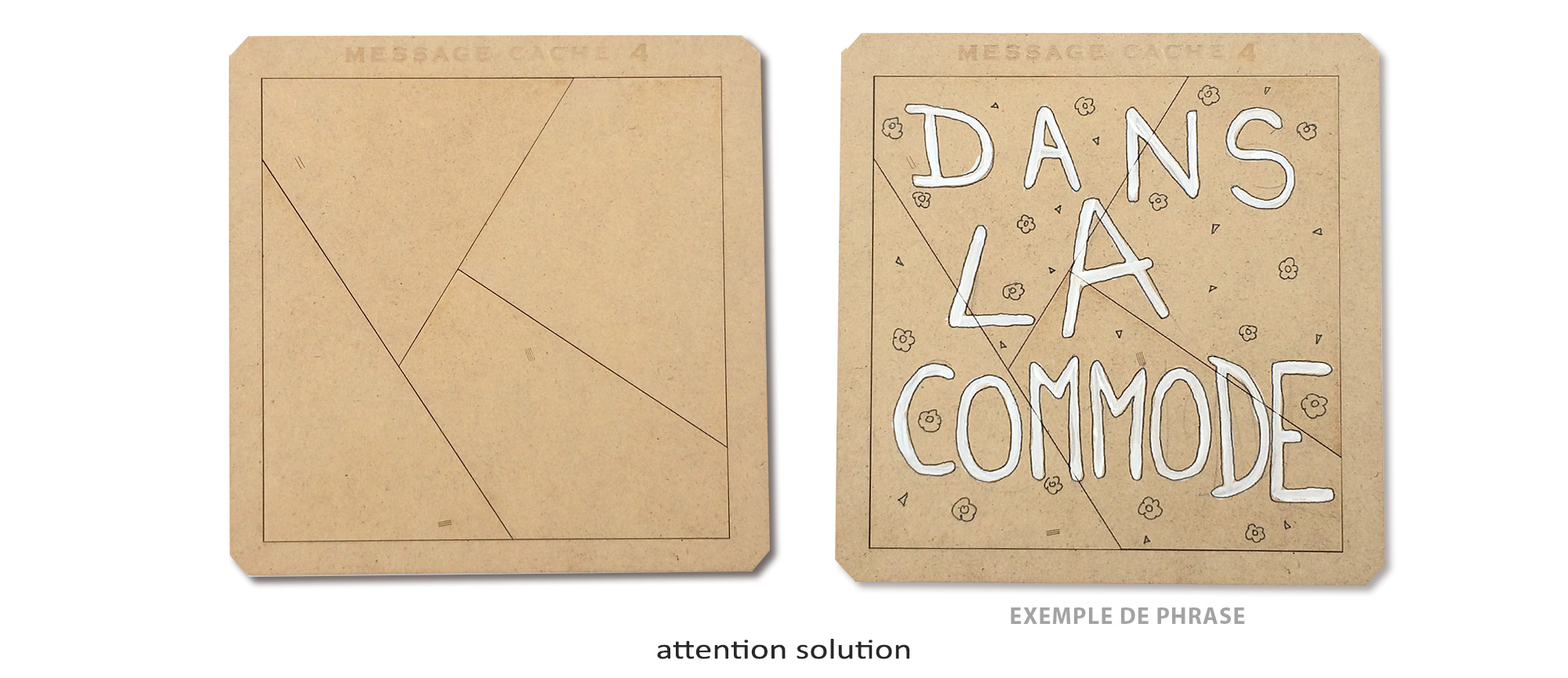 Utile pour un jeu de piste ou chasse au trésor. 4 tuiles sont à trouver, puis à placer dans le cadre pour former une phrase, une indication pour trouver le trésor, le goûter, l'indice suivant...