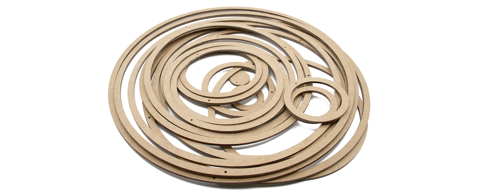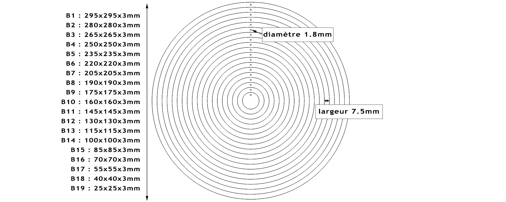 19 découpes sont envoyées. L'épaisseur est de 3 mm. La largeur du tous les cercles est de 7.5 mm. Le diamètre du trou est de 1.8 mm.