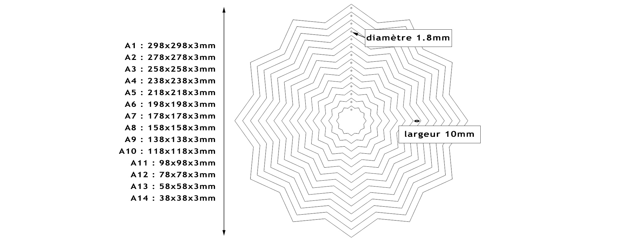 14 découpes sont envoyées. L'épaisseur est de 3 mm. La largeur du tous les soleils est de 10 mm. Le diamètre du trou est de 1.8 mm.