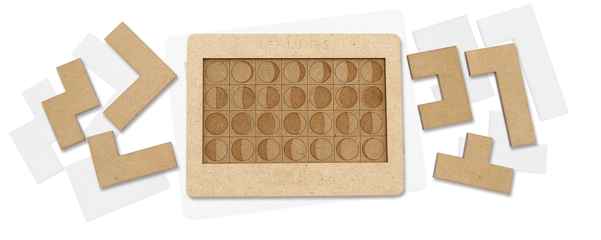 Jeu réalisé avec une découpe laser et du médium, collage avec colle à bois, teinture avec du brou de noix. Conçu en France, en Limousin, en Haute-Vienne.