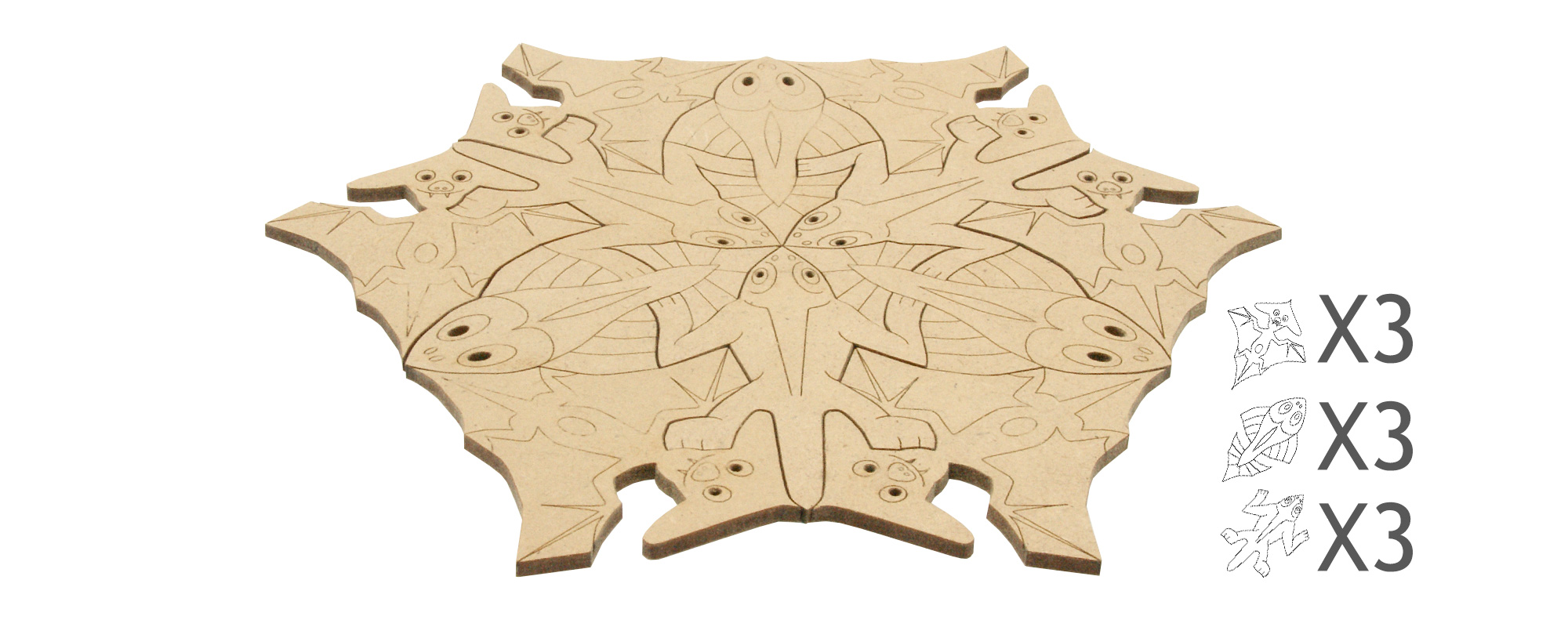Choisissez le nombre de chauve-souris, de lézards et de poissons rouges pour faire un petit ou grand puzzle. il n'y a pas de séquence. Ce pavage marche avec 3 pièces différentes