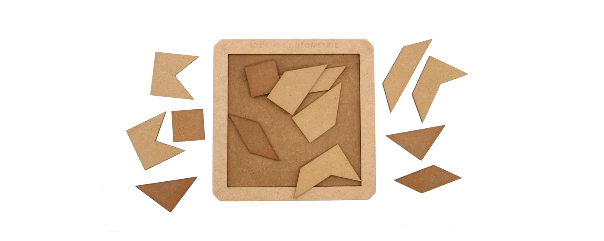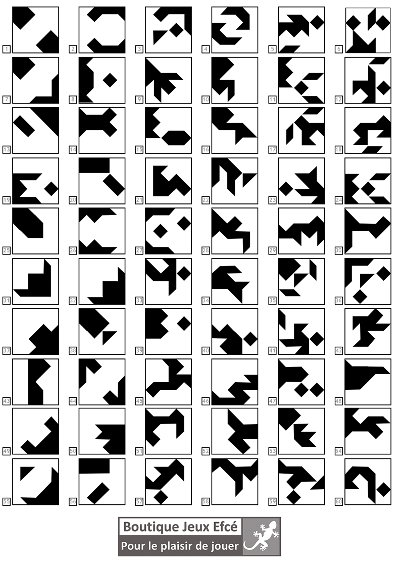 60 assemblages sont à trouver pour ce tangram. Une feuille A4 est remise avec le puzzle comprenant les 60 défis. Ce n'est pas les pièces foncées qui sont difficiles à placer !