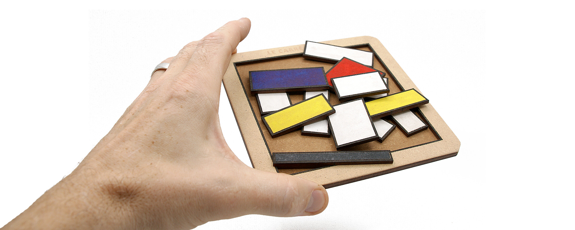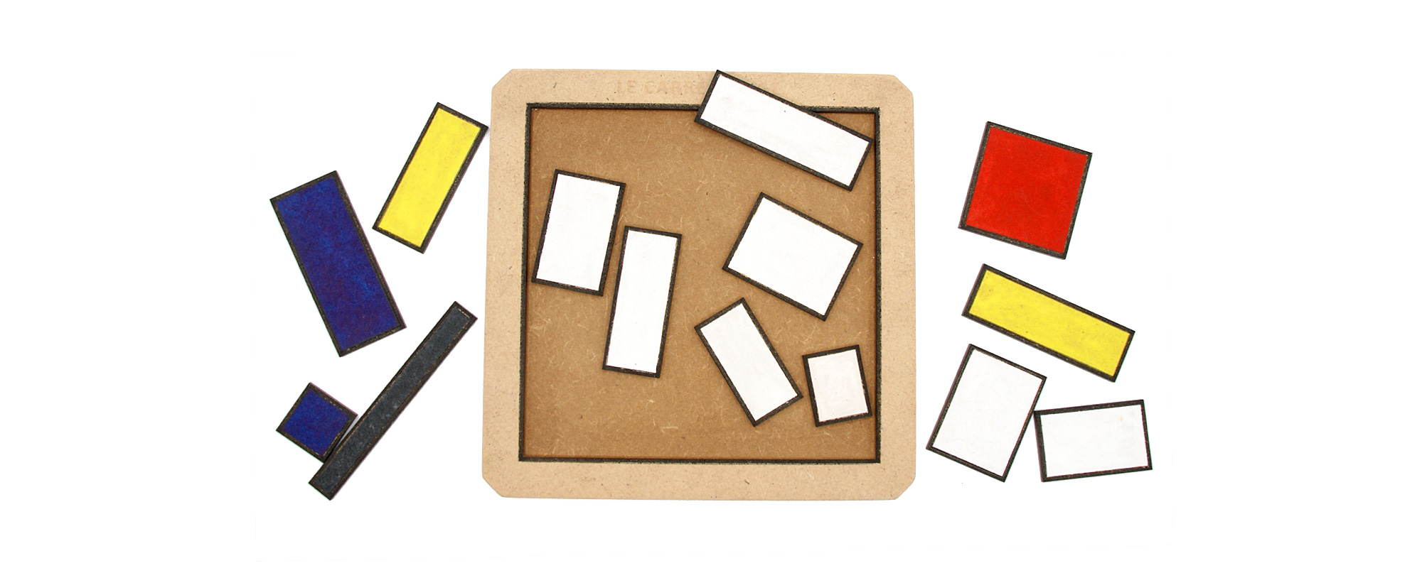 Clin d'œil fait au travail de Mondrian. Remplir le grand carré avec les 14 pièces. Trouvez votre harmonie. Plusieurs solutions sont possibles.