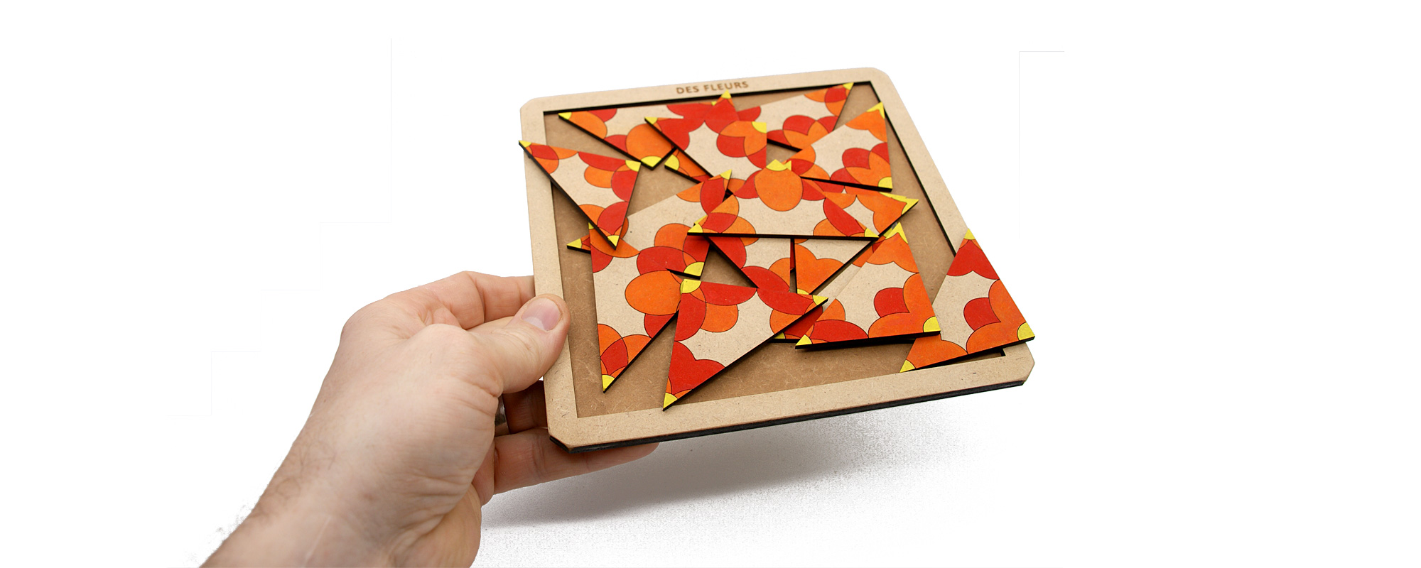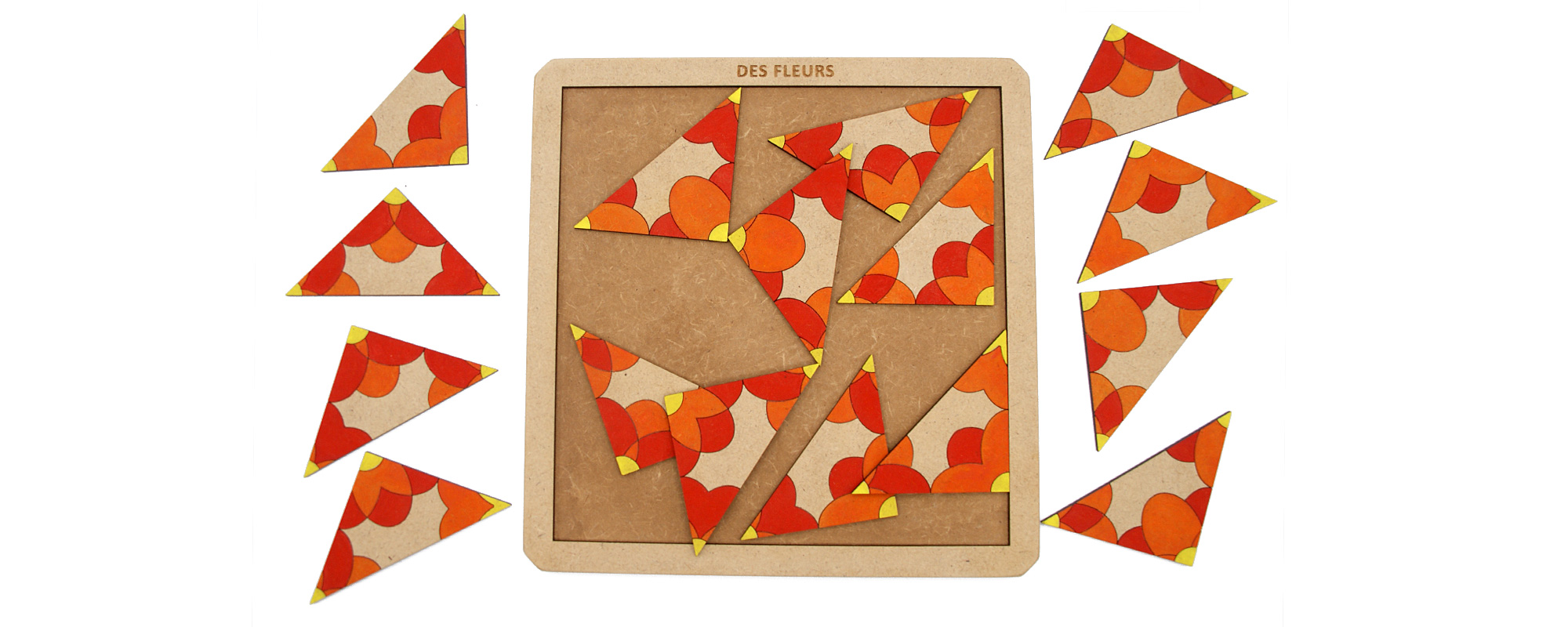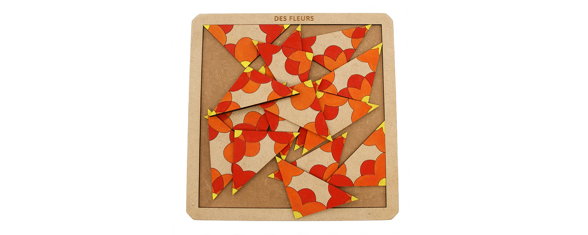 16 triangles sont à rentrer dans le carré pour tout remplir l'espace et retrouver les fleurs.