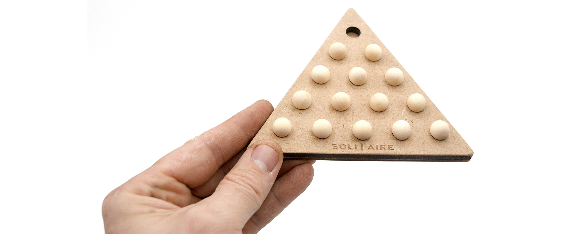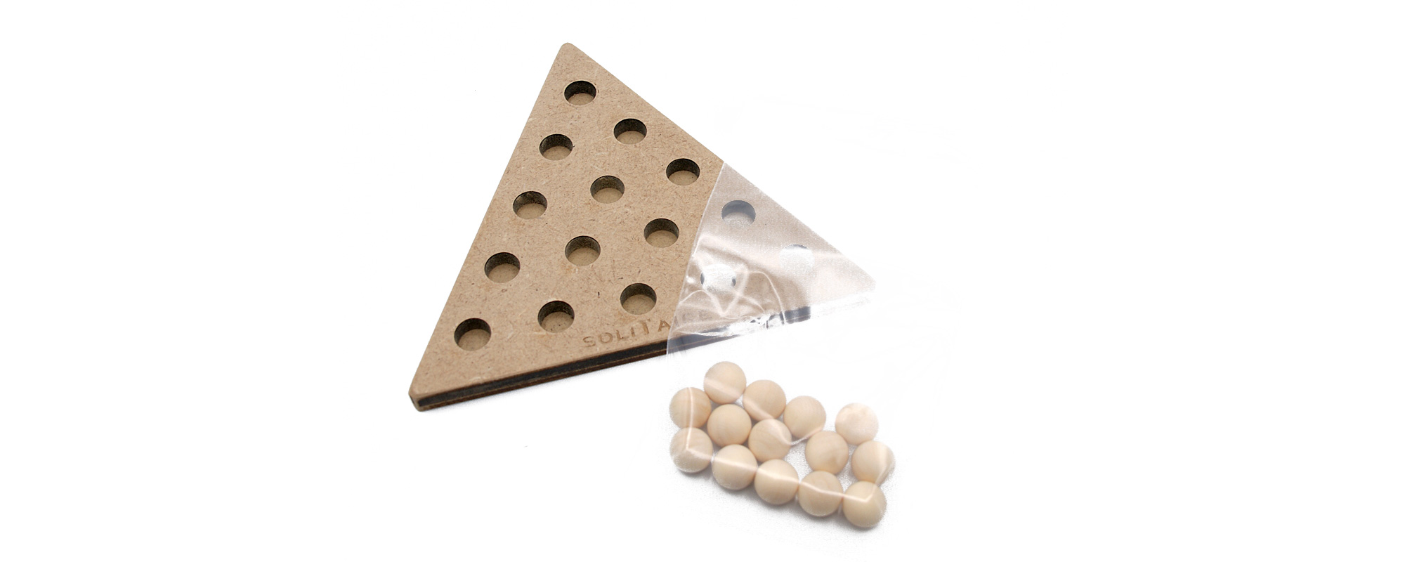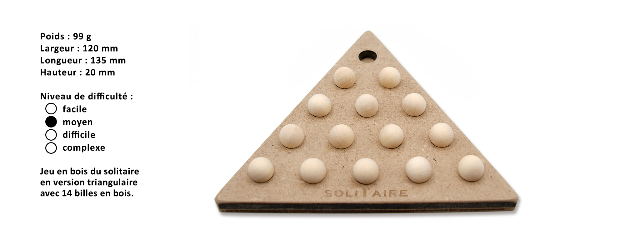 Jeu en bois du solitaire en version triangulaire avec 14 billes en bois.