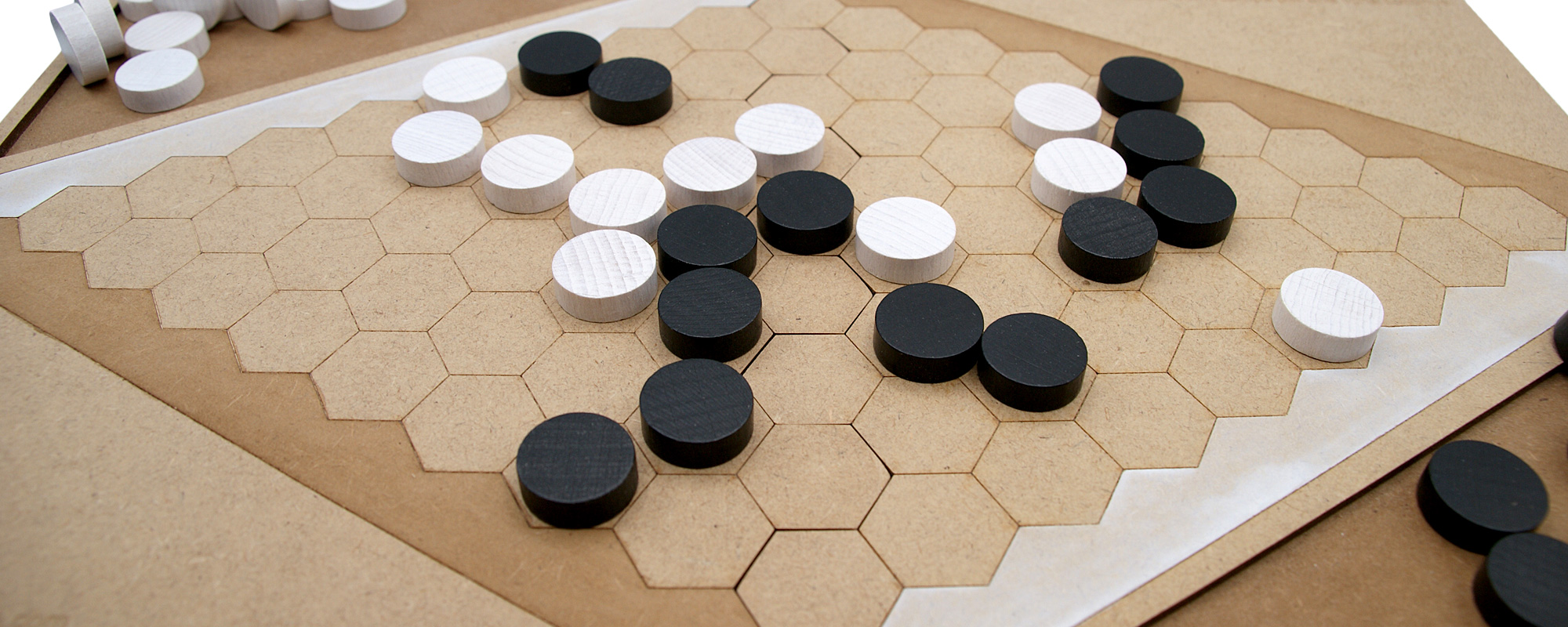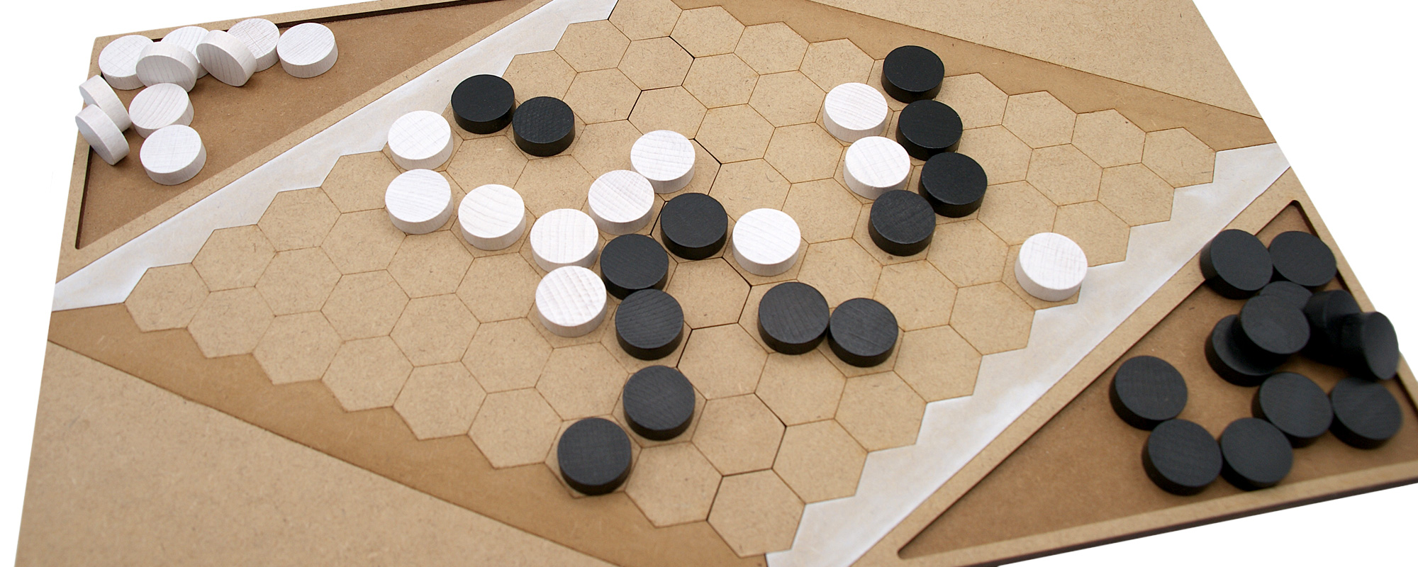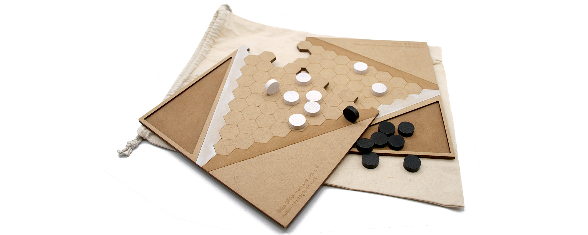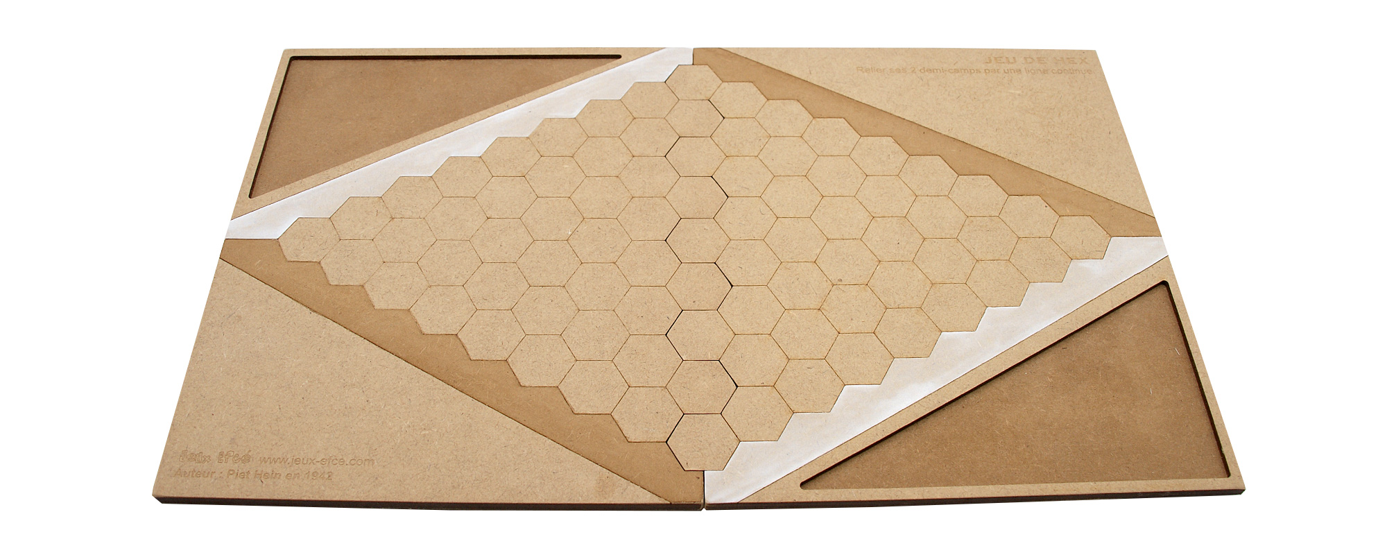 A son tour, chaque joueur pose un pion de sa couleur sur un des 81 hexagones. Le premier à relier ses 2 demi-champs a gagné ! Le mathématicien Piet Hein a démontré qu'il y a obligatoirement un gagnant si la totalité des hexagones du plateau est occupée pas ses pions des 2 camps. Un plateau de jeu en 2 morceaux, à plat cela donne 41x24 cm, 28 pions blancs et 28 pions noirs.