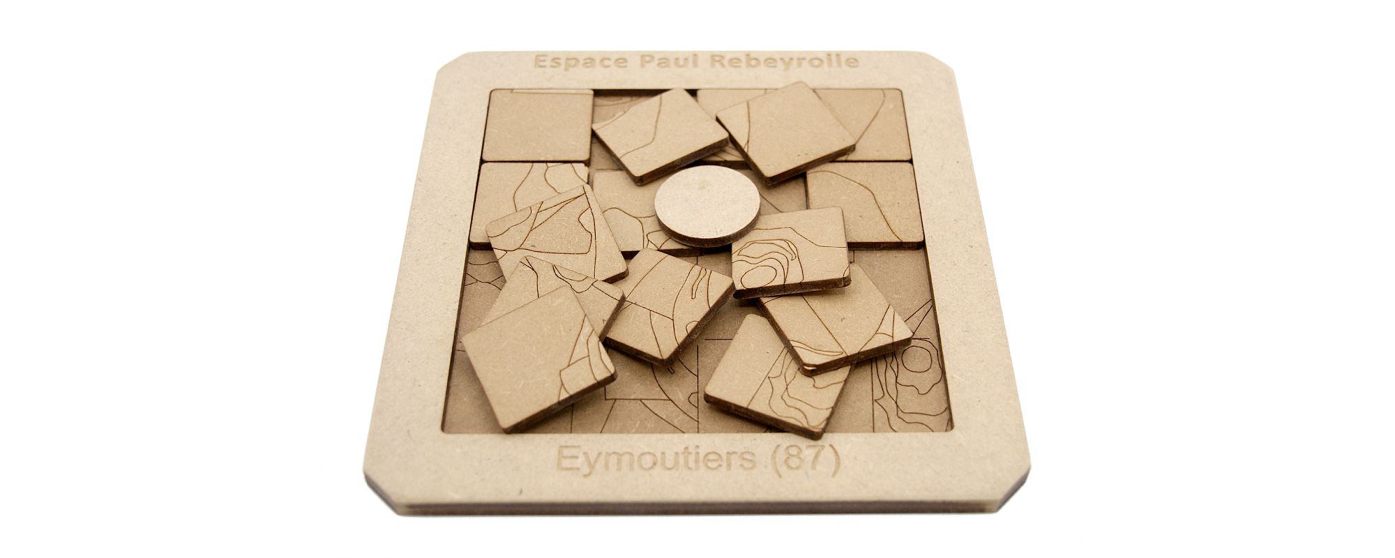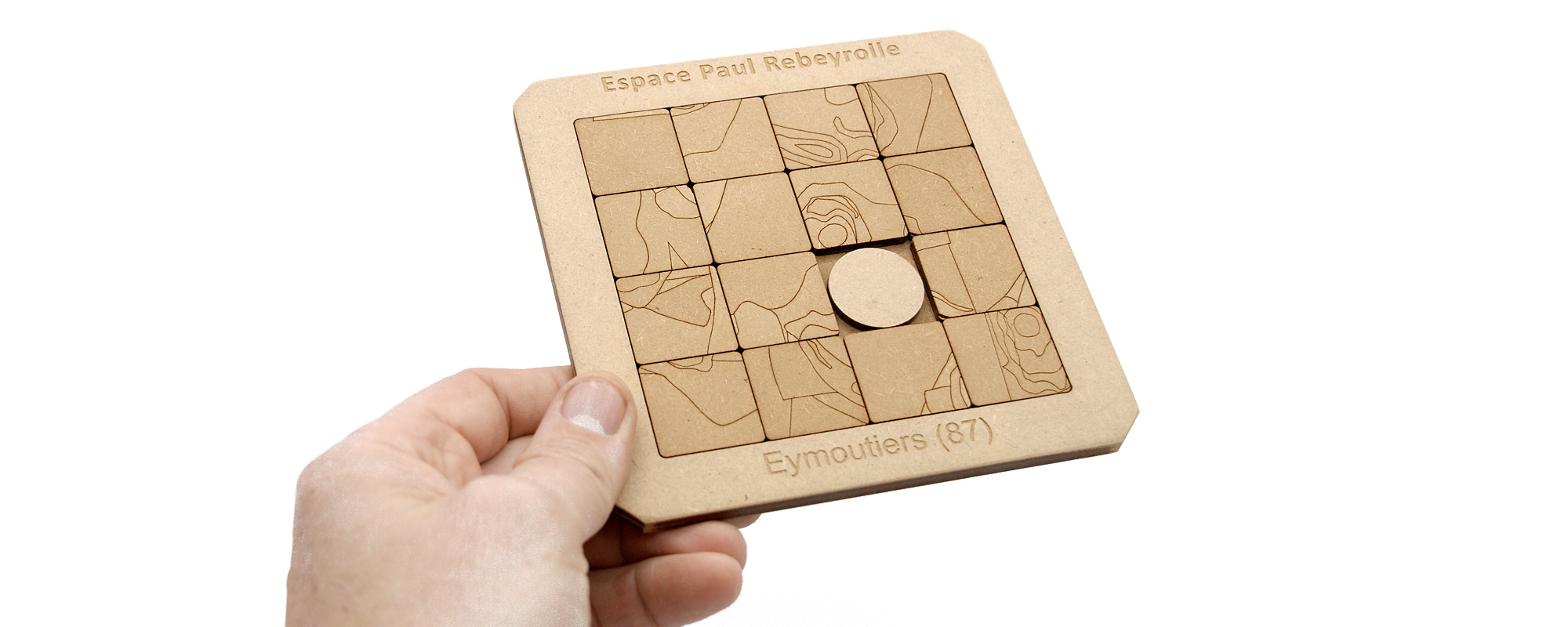 Jeu réalisé avec une découpe laser et du médium, collage avec colle à bois, teinture avec du brou de noix. Conçu en France, en Limousin, en Haute-Vienne.